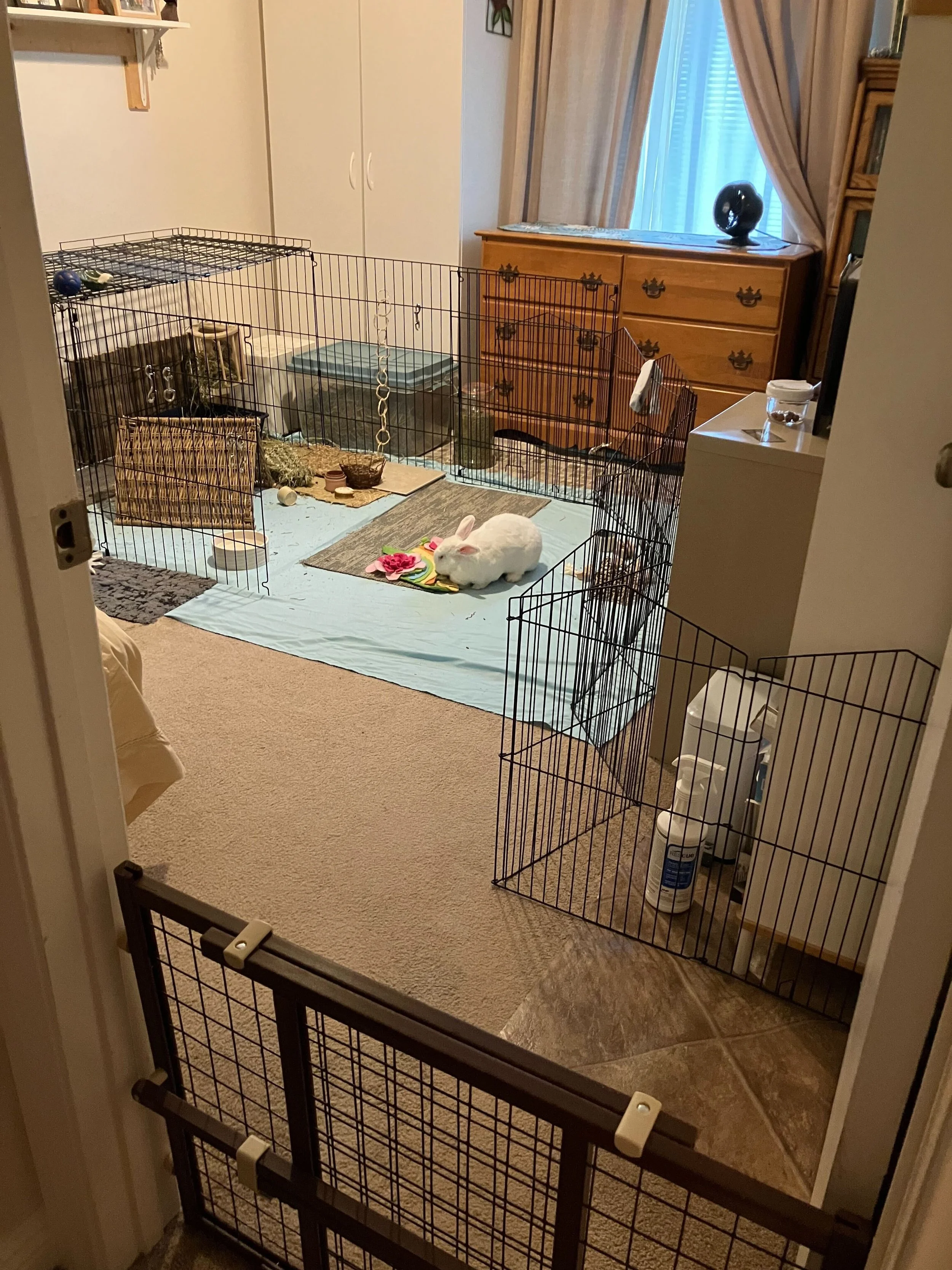 Two or more rabbits or larger rabbits require a 4’ x 8’ X-pen (minimum 30” tall).